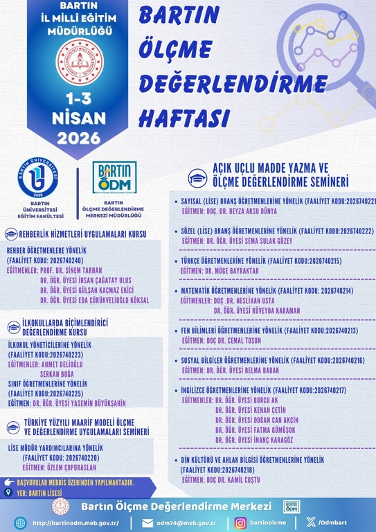 As part of the “Bartın Assessment and Evaluation Week [Bartın Ölçme ve Değerlendirme Haftası]” organized by Bartın İl Milli Eğitim Müdürlüğü [Bartın Provincial Directorate of National Education] between April 1–3, 2026, members of the Department of Foreign Language Education at Bartın University delivered a series of seminars and hands-on workshops for English teachers working in schools across the city.