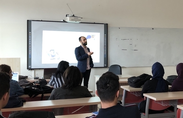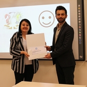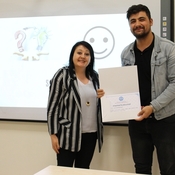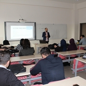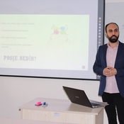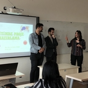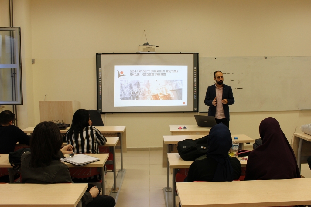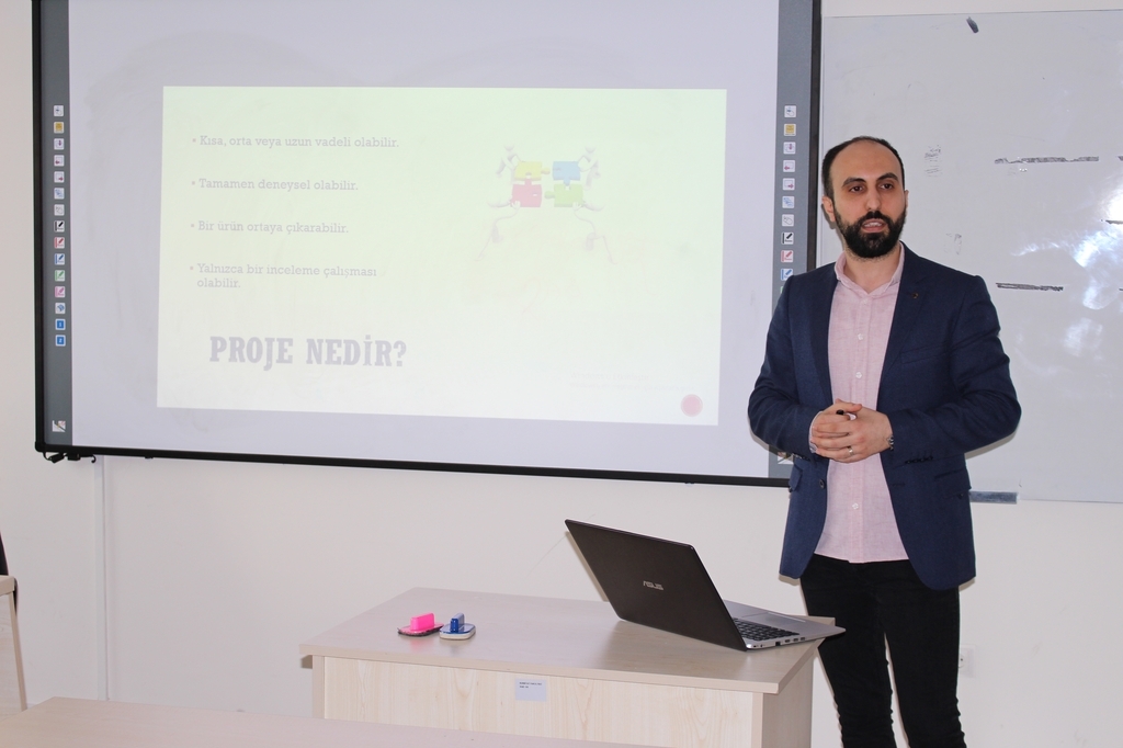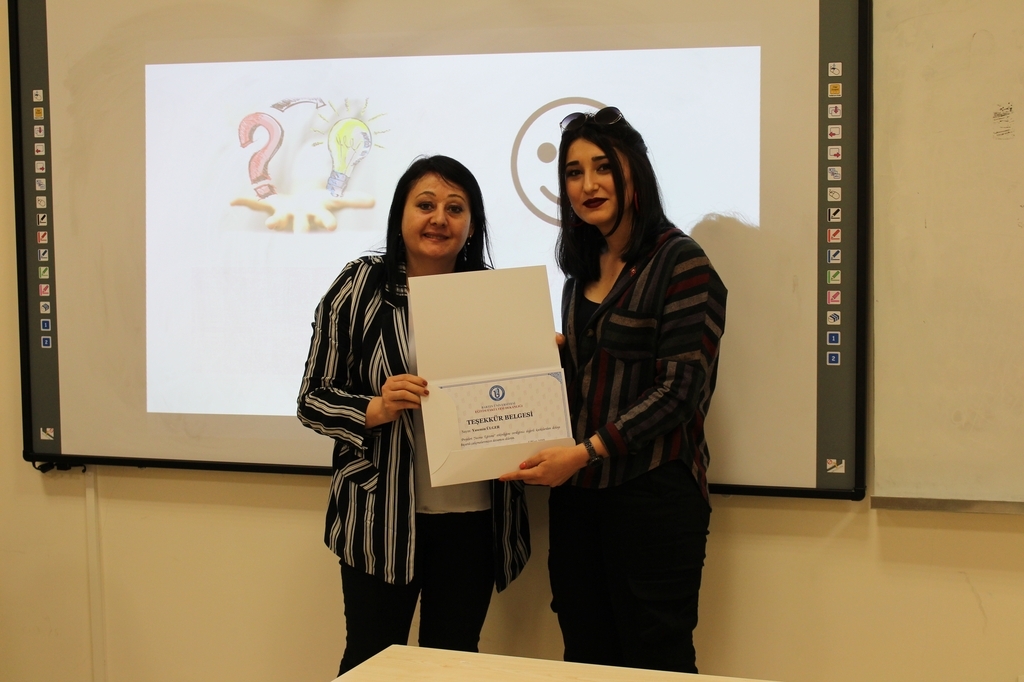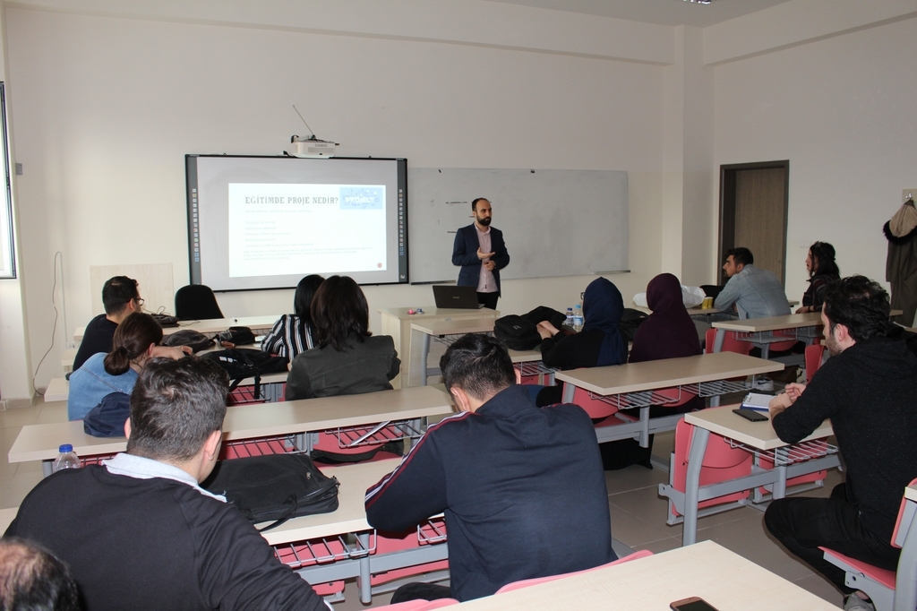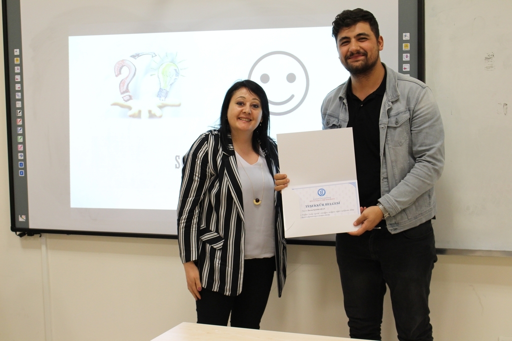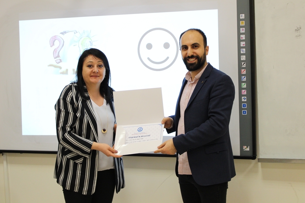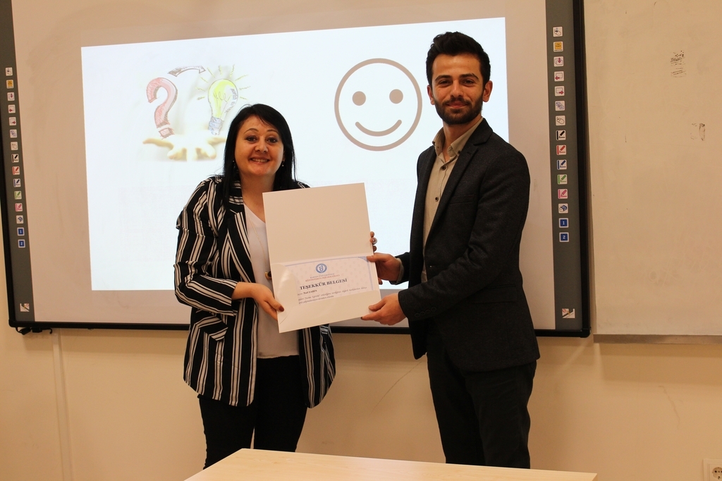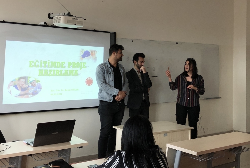 A training for writing projects in field of education took place at our campus on March 5, 2020. The presentations in the training were given by Res. Asst. Dr. Bekir Güler from Science Teaching program, and three students who were awarded with the certificate for second place at the national project exposition earlier this year. The students, namely, Faruk KAHRAMAN, Yasemin ÜLGER, and Nail ŞAHİN shared their experience in process of writing their project proposal. Moreover, some of the key processes of writing a project such as budget management, coordination, and originality of the choice of topics were introduced in the presentations, followed by a Q&A session given by the trainers. The meeting was concluded by awarding the trainers' certificates by the head of department, Asst. Prof. Dr. Burcu Şentürk.