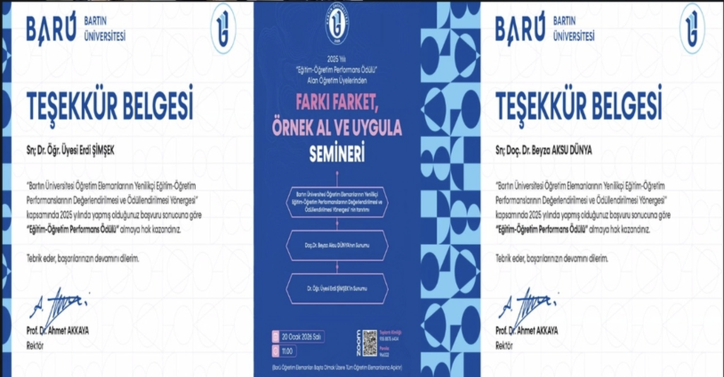Applications submitted under the provisions of the “Regulation on the Evaluation and Rewarding of Innovative Teaching–Learning Performance of Bartın University Academic Staff” have been finalized. As a result of their applications under this regulation, faculty members from the Faculty of Education—Assoc. Prof. Dr. Beyza Aksu Dünya with her course Computer-Assisted Educational Measurement and Dr. Erdi Şimşek with his course Individualizing and Adapting Teaching—were deemed eligible to receive the Teaching–Learning Performance Award.